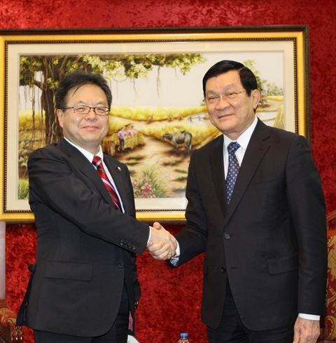 | Le président Truong Tân Sang (droite) et le secrétaire en chef adjoint du cabinet du Japon, Hiroshige Seko, le 12 avril à Hô Chi Minh-Ville. |