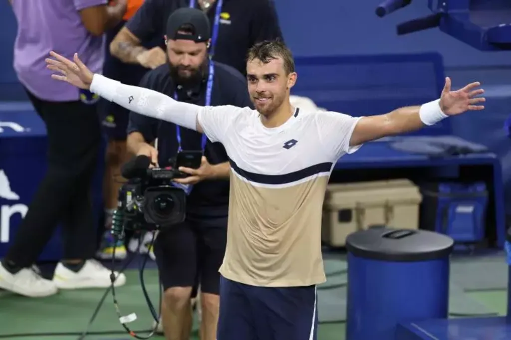 | Le Français Arthur Rinderknech après sa victoire contre l'Espagnol Alejandro Davidovich Fokina au deuxième tour de l'US Open à New York le 27 août. |