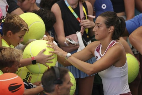 | Caroline Garcia signe des autographes après sa qualification face à Alison Riske à l'US Open à New York, le 4 septembre |