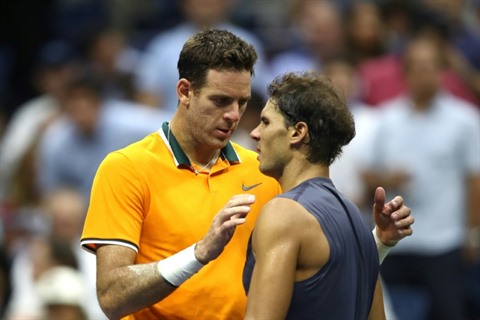 | L'Argentin Juan Martin Del Potro (gauche) lors de l'abandon du N.1 mondial Rafael Nadal, en demi-finales de l'US Open, le 7 septembre à New York. |