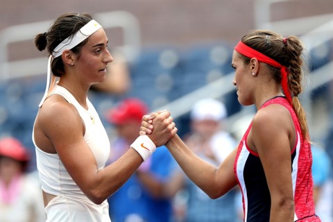 | La Française Caroline Garcia (gauche) serre la main de la Portoricaine Monica Puig après l'avoir battue au 2e tour de l'US Open, le 30 août à New York. |