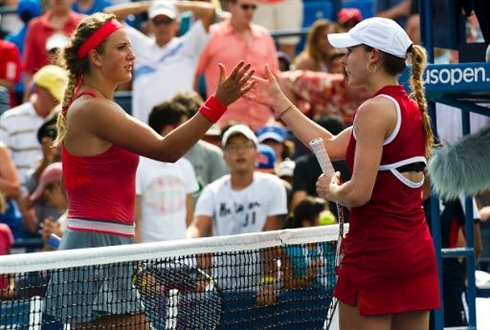 | Alizé Cornet (droite) avec Victoria Azarenka lors de l'US Open, le 31 août à New York. |