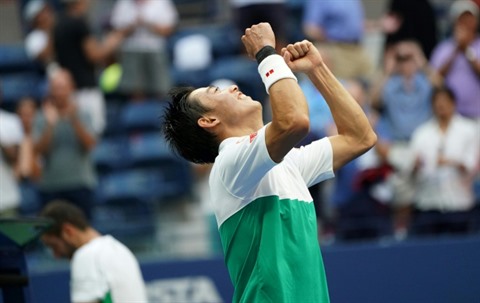 | Le Japonais Kei Nishikori, vainqueur en quart de finale de l'US Open contre le Croate Marin Cilic, le 5 septembre à New York. |