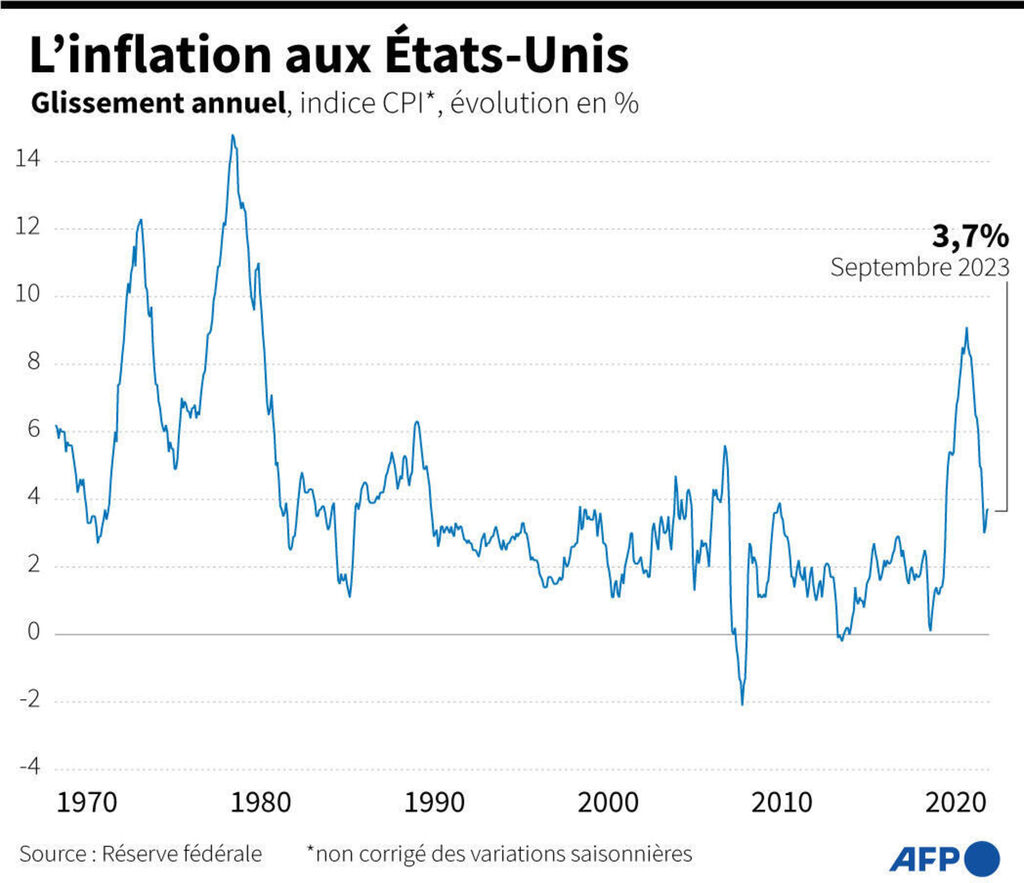 C'est en effet à la Fed que revient la tâche de faire baisser l'inflation, et elle veut la ramener autour de 2%. Pour cela, elle a relevé son principal taux directeur à 11 reprises depuis mars 2022. Mais lors de sa dernière réunion, fin septembre, il a été maintenu dans la fourchette de 5,25 à 5,50%.