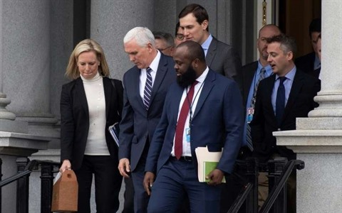 | Le vice-président américain Mike Pence (2e gauche), le secrétaire général de la Maison-Blanche, Jared Kushner (centre), et la ministre américaine de la Sécurité intérieure Kirstjen Nielsen (gauche), après une rencontre avec des réprésentants du Sénat et de la Chambre des réprésentants. |