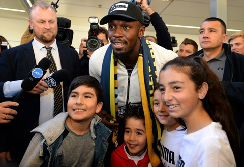 | Usain Bolt pose avec de jeunes fans à son arrivée à l'aéroport de Sydney, le 18 août. |