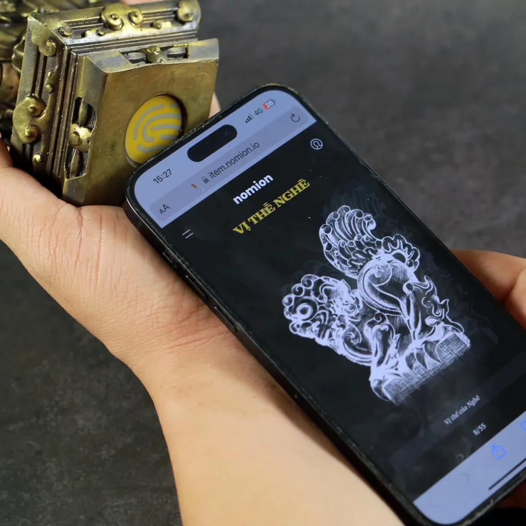 Nam Đỗ, co-fondateur et directeur technologique de Phygital Labs, explique que la puce d’identification Nomion, intégrée sous la base de la statue, enregistre numériquement son authenticité sur une plateforme en ligne. Grâce à un smartphone, les utilisateurs peuvent interagir avec la puce et découvrir le nom du propriétaire de la statue, attestant ainsi de son caractère unique.