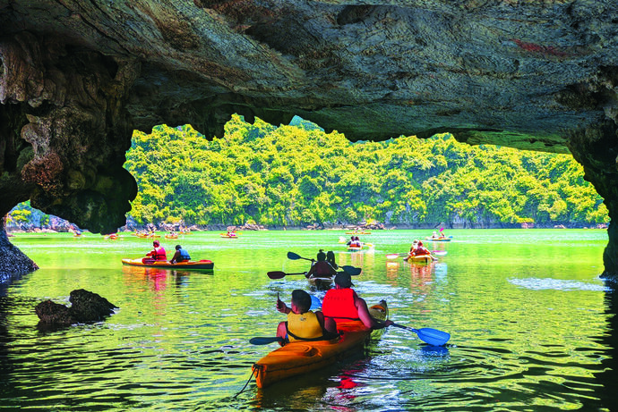 L’un des endroits attirant le plus les visiteurs dans la baie est la grotte Luôn, en forme d’arc, uniquement accessible en kayak ou en petit bateau.