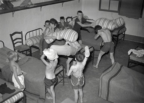 | Bataille de pelochons dans le dortoir d'une colonie de vacances en 1939 en France. |