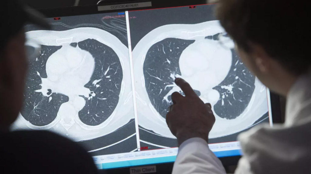 | Un médecin présente le scanner d'un patient ayant développé un cancer à la suite d'une infection au HPV au Bethesda Center dans le Maryland, aux États-Unis, en février 2018. |