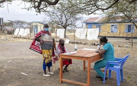 | Deux femmes Maasaï s'enregistrent dans un dispensaire pour être vaccinées à Kajiado (Kenya), le 9 septembre. |