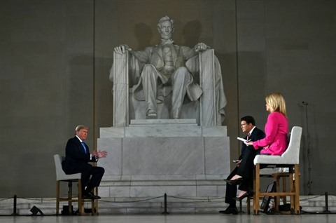| Le président américain Donald Trump répond aux questions des journalistes de Fox News depuis le Lincoln Memorial le 3 mai. |