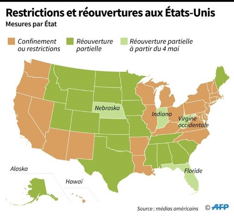 | Restrictions et réouvertures aux États-Unis prévues le 4 mai. |