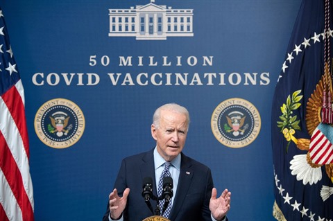 | Le président américain Joe Biden évoque les 50 millions de doses de vaccin administrées lors d'une conférence de presse à l'Eisenhower Executive Office Building de Washington, le 25 février. |