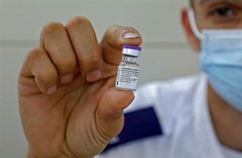 | Un employé du centre médical Magen David Adom de Jerusalem montre un flacon du vaccin Pfizer-BioNTech, le 26 février. |