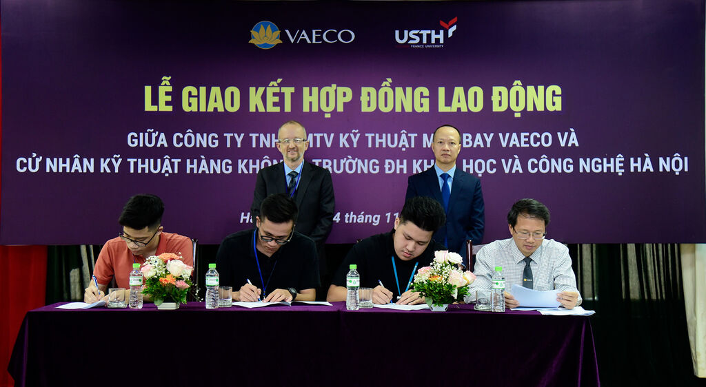 VAECO officialise aujourd’hui l’embauche de tous les étudiants de la première promotion du Département aéronautique de l’USTH. Au cours de la cérémonie de signature des contrats, tenue le 4 novembre à Hanoï, VAECO a exprimé sa satisfaction quant à la formation des étudiants et de sa collaboration avec l’USTH.