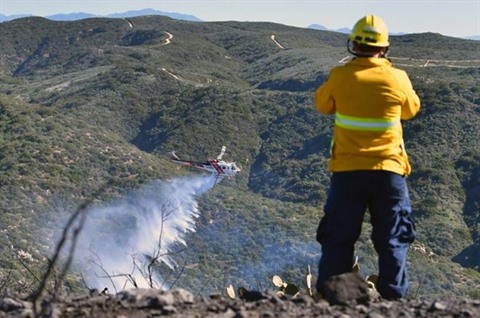 | Un hélicoptère déverse de l'eau sur une colline encore fumante après un incendie à Laguna Beach, en Californie, victime d'une vague de chaleur, le 10 février. |