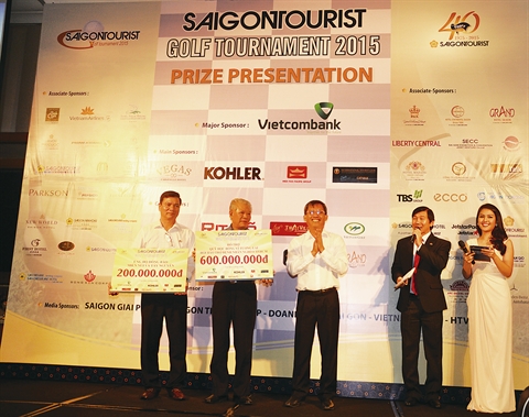 | Lê Ngoc Co (centre), directeur général adjoint de Saigontourist, a remis deux chèques d’une valeur de 800 millions de dôngs lors de 10e tournoi du golf du voyagiste. |