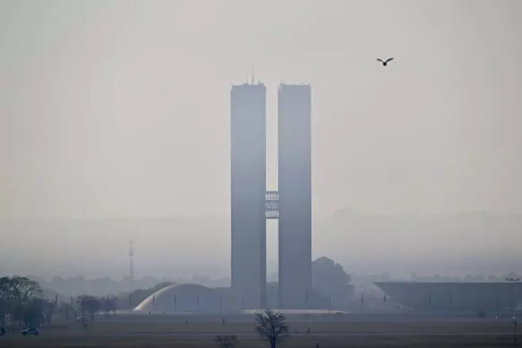 | Le Congrès national du Brésil partiellement recouvert de fumée en raison d'un incendie dans le parc national de Brasilia, le 16 septembre 2024. |