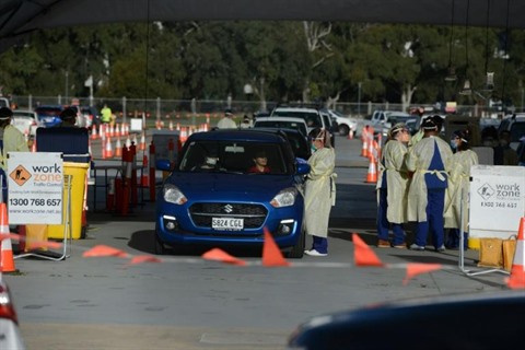 | Un centre de test anti-COVID en drive-in, le 20 juillet à Adelaïde, en Australie. |