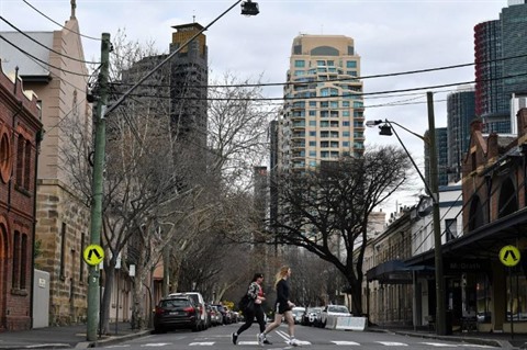 | Deux passantes dans une rue déserte de Sydney pendant un confinement, le 19 juillet en Australie. |