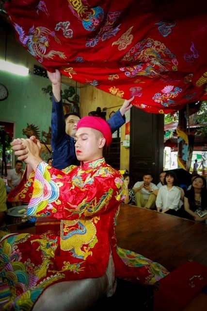 Certains médiums trouvent également un sentiment de sécurité et de croyance dans la vie spirituelle via le rituel hâu dông. Dans cette activité, les ông dông et bà dông (les médiums masculins et féminins) utilisent leurs corps vides pour l’incarnation des esprits et des dieux. Personne ne peut volontairement devenir un médium parce que le médium est choisi par les Déesses-Mères et les dieux à travers un attachement prédestiné. Pendant le rituel hâu dông, les médiums reçoivent le soutien de quatre assistants (hâu dâng), qui les aident à brûler des encens et à changer de costumes. Notamment, les quatre hâu dâng couvrent la tête des médiums d’un voile rouge (khan phu diên), qui est un rite important répété plusieurs fois pendant le rituel hâu dông signalant le moment où un esprit entre ou sort du médium.