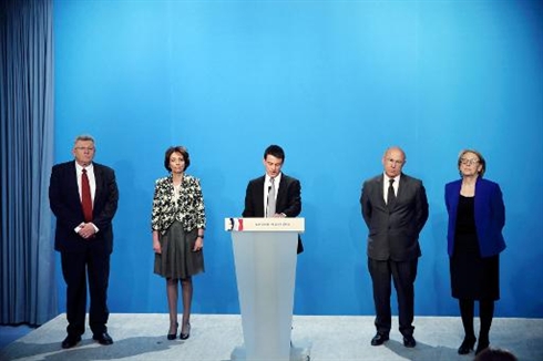 | Manuel Valls (centre) lors de son intervention, le 16 avril après le Conseil des ministres |