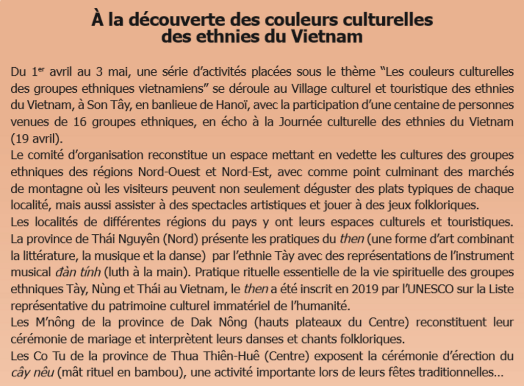 Par conséquent, dans le contexte d’intégration internationale, il est urgent de tout mettre en œuvre pour préserver et promouvoir les valeurs culturelles en tissant des liens étroits avec les programmes, projets et politiques de développement socio-économique dans les régions peuplées de minorités ethniques.