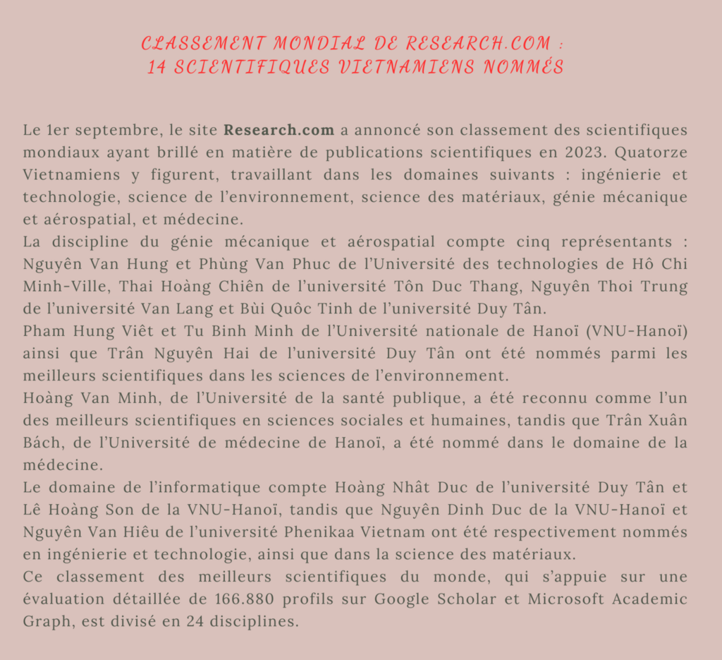 D’après le Dr. Lê Duc Viên, directeur du Service municipal des sciences et des technologies de Dà Nang, dans le contexte de promotion de l’industrialisation, de la modernisation et de l’intégration internationale du pays, en particulier face aux défis et opportunités de la 4e révolution industrielle, il est de plus en plus urgent de mettre en avant le rôle des intellectuels. “Il est essentiel de concentrer les investissements dans la science, la technologie et l’innovation, car il s’agit-là d’un environnement propice à la créativité et à l’engagement des intellectuels dans le développement du pays”, a-t-il conclu.