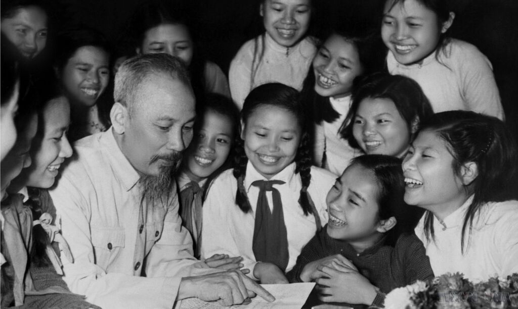 | Des élèves de l'école Trung Vuong, représentant ceux ayant obtenu d'excellents résultats dans le mouvement de compétition "Bien étudier" de Hanoï, sont venus présenter leurs vœux pour l'anniversaire du Président Hô Chi Minh, le 19 mai 1958, au Palais présidentiel. |