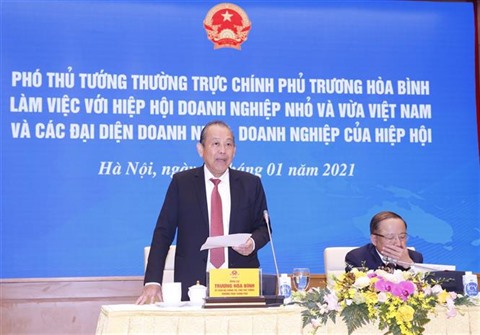 | Le vice-Premier ministre permanent Truong Hoà Binh lors d'une rencontre des représentants de l'Association des PME du Vietnam, le 7 janvier à Hanoï. |
