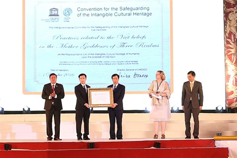 | Remise du certificat de «Patrimoine culturel immatériel de l’humanité» par l'UNESCO pour «Les pratiques liées à la croyance Viêt en les déesses-mères des Trois mondes», le 2 avril 2017 dans la province de Nam Dinh (Nord). |