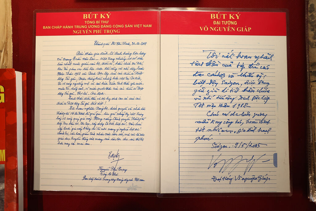 | Notes de l’ancien secrétaire général du PCV, Nguyên Phu Trong, et du Général Vo Nguyên Giap lors de la visite des vestiges du bunker d'armes du commando Thành qui a attaqué le Palais de l'Indépendance en 1968. |