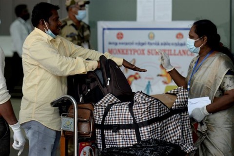 | Du personnel médical examine les passagers à la recherche de symptômes de la variole du singe, à l'aéroport international de Chennai, le 3 juin en Inde. |