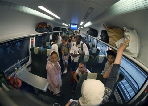 | Des migrants voyagent dans un train en provenance de Budapest et à destination de Vienne, le 31 août. |