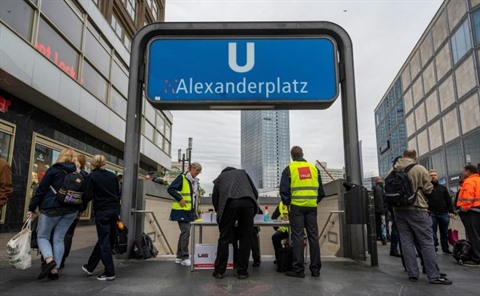 | Des salariés des transports et des syndicalistes devant l'entrée de la station de métro Alexanderplatz, lors d'un mouvement de grève dans les transports, le 29 septembre à Berlin. |
