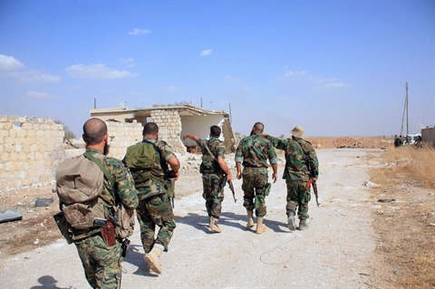 | Des soldats syriens près de l'aéroport militaire de Kweyris, dans la province d'Alep (Nord de la Syrie), le 16 octobre. |