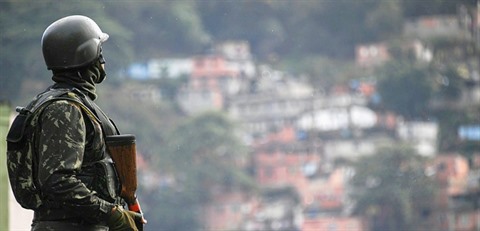 | Un militaire près d'une favela de Rio de Janeiro, le 5 août 2017. |