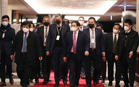 | Le Premier ministre Pham Minh Chinh (centre) arrive à la séance de haut rang du VBF 2022 à Hanoï, le 21 février. |