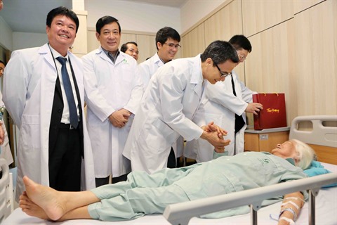 | Le vice-Premier ministre Vu Duc Dam (droite) visite un patient âgé de l’Hôpital central de gérontologie. |