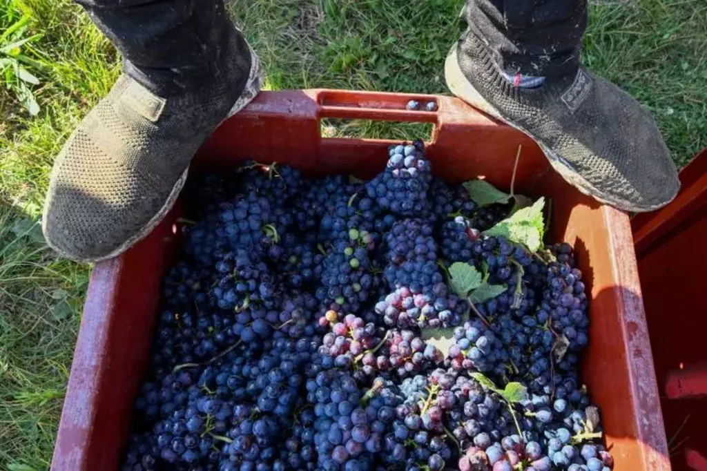 | Un vendangeur se tient sur une caisse de raisin lors d'une récolte dans un vignoble d'Igny-Comblizy, en Champagne, le 19 septembre 2024. |