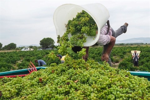 | Un ouvrier travaillant pour le domaine Lafage déverse des grappes de Muscat d'Alexandrie dans une benne au cours des vendanges à Rivesaltes le 7 août. |