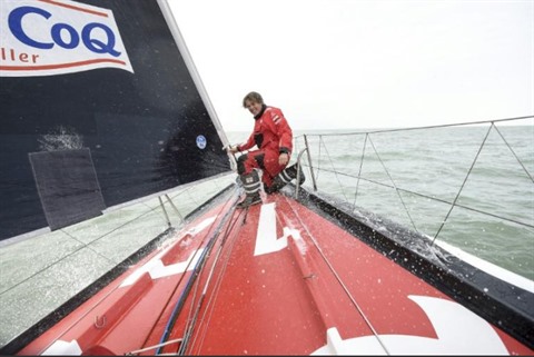 | Le skipper Yannick Bestaven sur son monocoque "Maître coq", le 7 octobre au large de La Rochelle. |