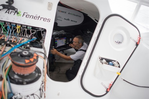 Jeudi 10 décembre a été une journée compliquée pour Fabrice Amedeo(Newrest - Art & Fenêtres). Son second ordinateur vient de tomber en panne alors que le premier est déjà hors service. Il ne reçoit plus d'information météo ce qui est évidemment particulièrement handicapant. Le skipper tente de réparer.