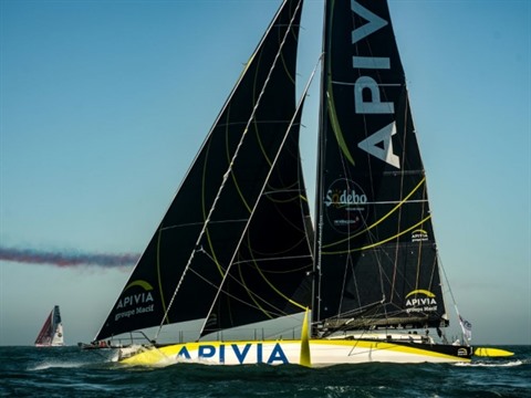 | Le voilier "Apivia" skippé par Charlie Dalin lors du départ du Vendée Globe depuis Les Sables-d'Olonne, le 8 novembre 2020. |