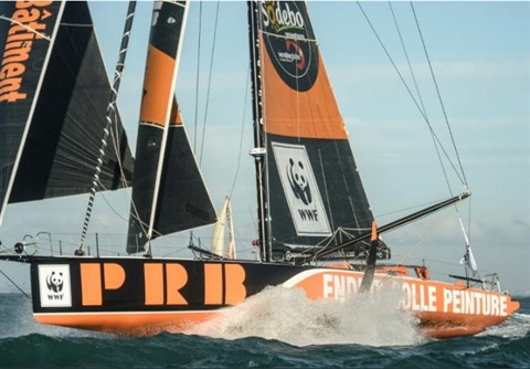 | Le skipper Kevin Escoffier (PRB) après le départ du Vendée Globe, aux Sables-d'Olonne, le 8 novembre. |