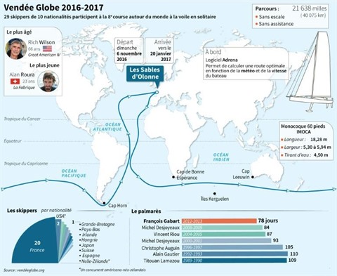 Dans les esprits: les quelque 40.000 kilomètres (21.000 milles) à parcourir et pour certains le record de la course, établi lors de la dernière édition, en 2013 par François Gabart en 78 jours 02 heures et 16 minutes. Selon les spécialistes de la voile, une dizaine de concurrents sont en mesure d'arracher, aux alentours du 20 janvier, la victoire qui, pour l'instant, n'a jamais échappé à un Français.