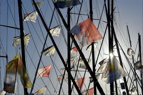 | Les drapeaux flottent au dessus des Imoca, aux Sables-d'Olonne, avant le départ du Vendée Globe, le 5 novembre 2016. |