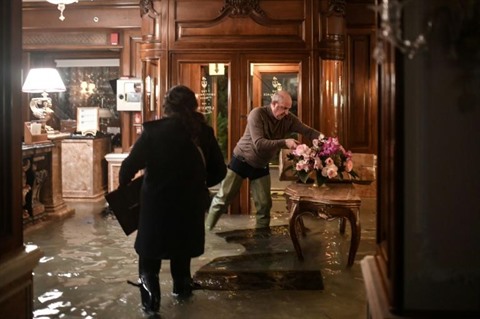 | Les employés du Gritti Palace mettent les meubles à l'abri pendant un épisode d'"acqua alta" (marée haute) d'une ampleur exceptionnelle à Venise, le 12 novembre. |