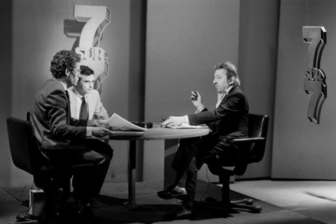| Serge Gainsbourg (droite) répond aux questions des journalistes Jean-Louis Burgat et Érik Gilbert (centre) le 11 mars 1984 lors de l'émission 7 sur 7 durant laquelle il brûla un billet de 500 francs. |